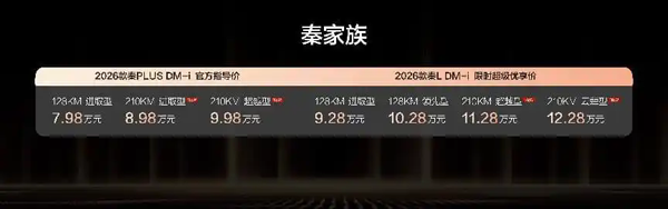 | 1月8日,比亚迪正式推出2026款秦L DM-i与秦PLUS DM-i双车210公里长续航版本,售价区间为8.98万元至12.28万元。其中,2026款秦L DM-i 210公里长续航版限时超级优享价11.28万元至12.28万元;2026款秦PLUS DM-i 210公里长续航版售价8.98万元至9.98万元,并同步推出多项上市权益。 作为一款在家轿市场累计销量突破270万辆的车型,此次秦家族在续航、配置、智能等方面实现升级。双车纯电续航均达210公里,满油满电综合续航突破2110公里,百公里亏电油耗低至2.79升。 外观方面,秦L DM-i提供墨竹青、星河米等6款车色,秦PLUS DM-i新增松烟绿、未央灰等3款车色,共7种配色满足多元审美。内饰换装集成式电子怀挡,释放储物空间,提升操作便利性。 配置上,秦L DM-i搭载云辇-C智能阻尼车身控制系统与预瞄系统,配合多连杆独立悬架,实现优秀的底盘质感;一体式智能冷暖冰箱支持四季温控,W-HUD抬头显示降低分心风险,前排远端侧安全气囊减少二次伤害。秦PLUS DM-i则搭载天神之眼C辅助驾驶系统,支持高快领航、智能泊车等功能,智能座舱高阶版DiLink 100支持手车互联、无麦K歌等娱乐功能。 比亚迪还构建起“人车家智慧生态圈”,与好孩子、倍轻松合作实现智能儿童座椅、按摩仪的语音控制。秦L DM-i顶配车型还限时赠送价值3000元的TBC高速爆胎稳行系统,秦PLUS DM-i提供至高4000元置换补贴及4000元金融贴息。 校检:陈沙 韩京华 审核:朱沙 来源:北京日报客户端 |