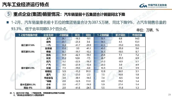 3月11日,中国汽车工业协会(以下简称“中汽协”)发布的最新数据显示,2月,我国汽车产销分别完成167.2万辆和180.5万辆,环比分别下降31.7%和23.1%,同比分别下降20.5%和15.2%。1至2月,我国汽车产销分别完成412.2万辆和415.2万辆,同比分别下降9.5%和8.8%。 据中汽协分析,今年春节在2月中下旬,且假期有所延长,2月有效工作日仅16天,企业生产经营受到一定影响,市场活跃度总体有所下降。从1-2月行业运行情况看,汽车产销受政策切换调整、需求前置释放、春节假期错位、消费意愿不足、同期高基数等多重因素叠加影响,同比呈现下滑。其中,乘用车市场和新能源汽车同比下降,商用车市场持续向好,汽车出口快速增长。 就乘用车市场来看,2月乘用车产销分别完成140万辆和153.6万辆,环比分别下降32.1%和22.7%,同比分别下降21.6%和15.4%。1至2月,乘用车产销分别完成346.2万辆和352.4万辆,同比分别下降12%和10.7%。 2月,乘用车国内销量95万辆,环比下降32.1%,同比下降34.2%。其中,传统燃料乘用车国内销量50.5万辆,比去年同期减少22.1万辆,环比下降38%,同比下降30.4%。 具体到企业,在2月汽车销量排名前十的企业中,上汽以26.1万的销量排名榜首,吉利是唯一一家销量同比上涨的企业,同比增幅仅为3.6个百分点。此外,长安是唯一一家销量环比上涨的企业,环比增长12.8%。 1至2月,汽车销量排名前十五位的集团销量合计为387.5万辆,同比下降9%,占汽车销售总量的93.3%,低于去年同期0.3个百分点。 新能源汽车市场也下滑。2月,新能源汽车产销分别完成69.4万辆和76.5万辆,同比分别下降21.8%和14.2%,新能源汽车新车销量达到汽车新车总销量的42.4%。 在出口方面,2月汽车出口67.2万辆,环比下降1.4%,同比增长52.4%。1至2月,汽车出口135.2万辆,同比增长48.4%。 新能源汽车出口保持高速增长。2月,新能源汽车出口28.2万辆,环比下降6.6%,同比增长1.1倍;传统燃料汽车出口39.1万辆,环比增长2.8%,同比增长26.2%。1至2月,新能源汽车出口58.3万辆,同比增长1.1倍;传统燃料汽车出口76.9万辆,同比增长22.2%。 在2月整车出口前十企业中,奇瑞出口量达12.4万辆,同比增长44.1%,占出口总量的18.5%。与去年同期相比,特斯拉出口增速最为显著,出口达2万辆,同比增长4.2倍。 在1至2月整车出口前十企业中,奇瑞出口量达24.3万辆,同比增长45.6%,占出口总量的18%。与去年同期相比,吉利出口增速最为显著,出口达15.6万辆,同比增长1.5倍。 |